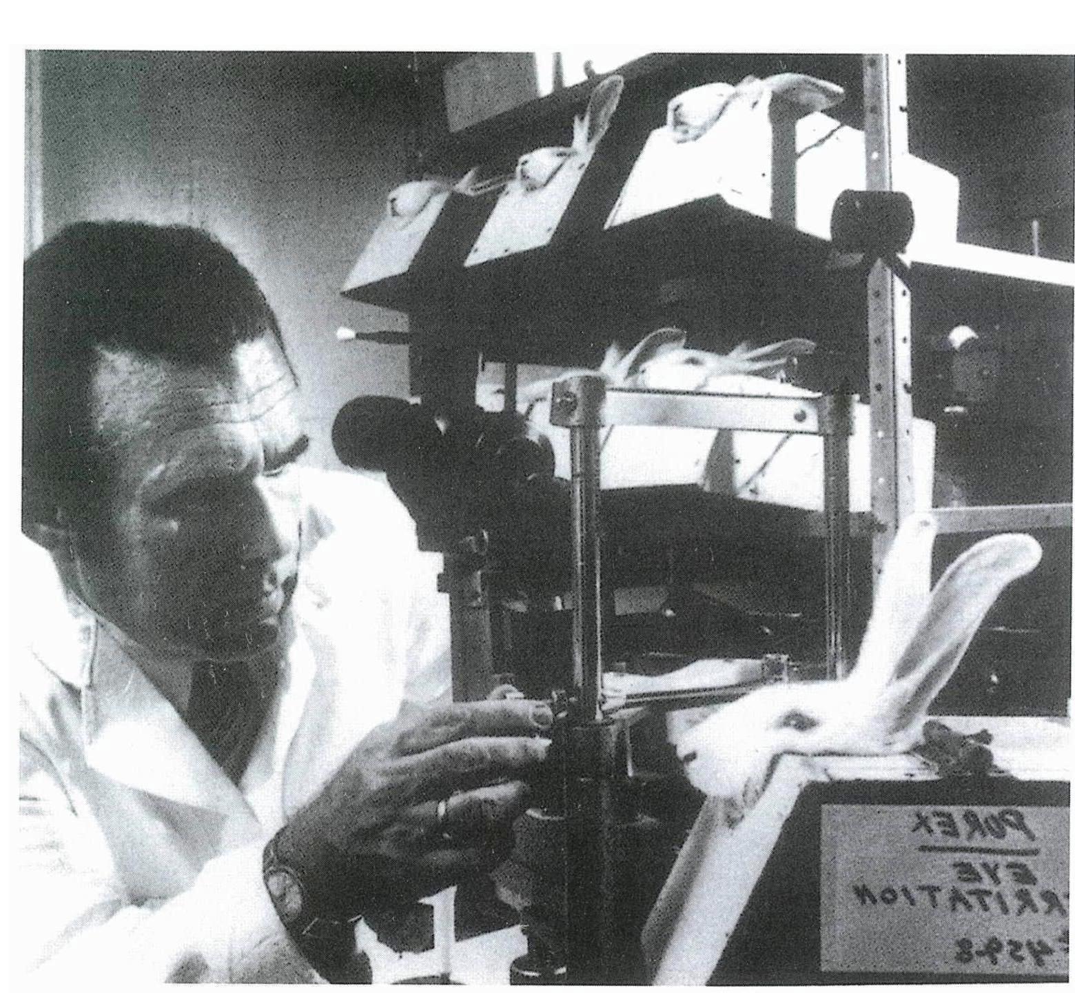 Above right: The Draize eye irritancy test. UPI/ Bettman Archive photo.